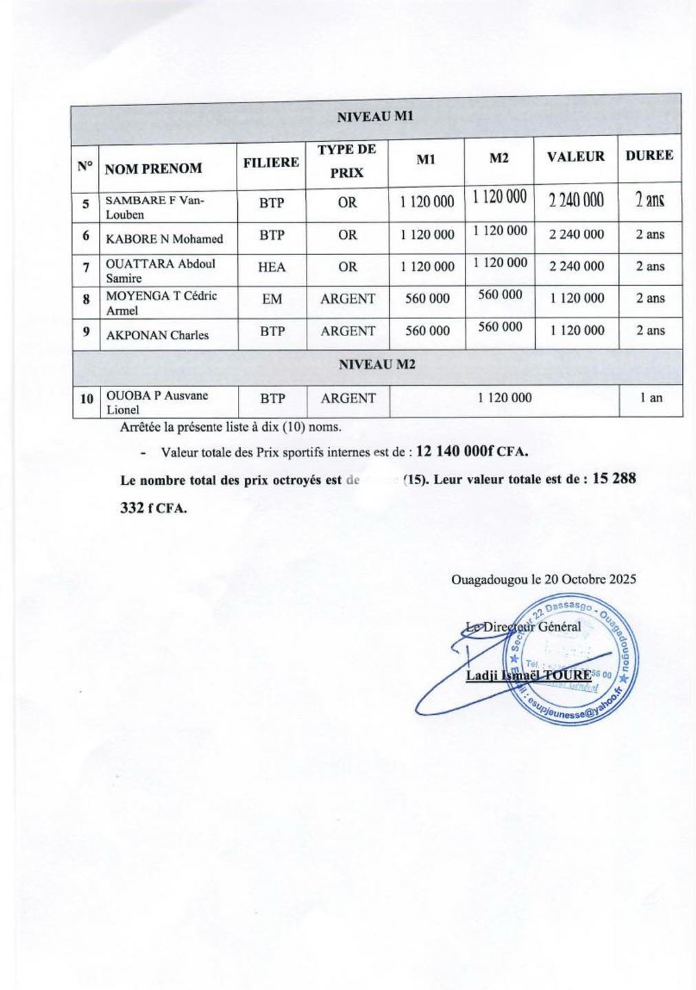 La valeur totale des prix attribués s’élève à 15 288 332 FCFA, en reconnaissance du talent, de l'engagement et de la passion de nos jeunes champions.